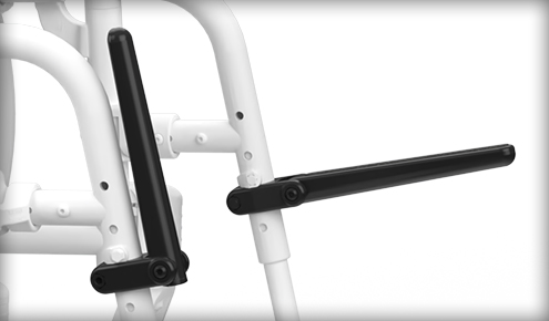 Zasnovan, da ostane tiho na mestu s stabilnim in brezšumnim sistemom pritrditve. Vgrajena nastavljivost kota omogoča lažje prilagajanje kotu naslona in naknadno nameščenim sistemom sedežev. Lahko se montira na levo ali desno stran vozička.