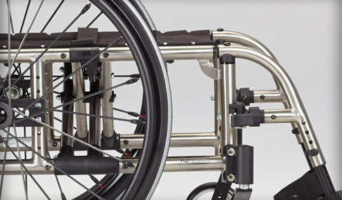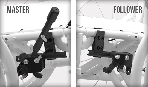 Nastavljivo po kotu in omogoča sprednje ali zadnje montažne položaje za optimalno konfiguracijo vozička, zmanjšanje medosne razdalje ter prilagoditev višine koles in sedeža.