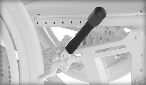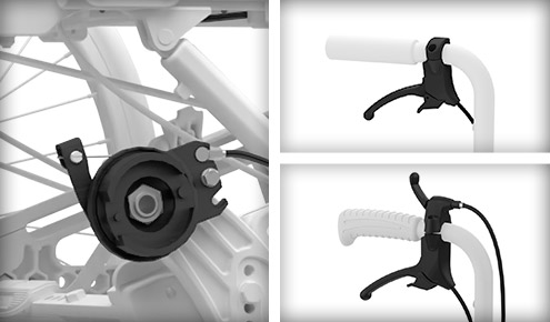 Omogoča postopno zaviranje, ne le zaklep koles. Dvojna ročica združuje nagib in zaviranje.
