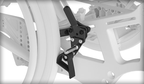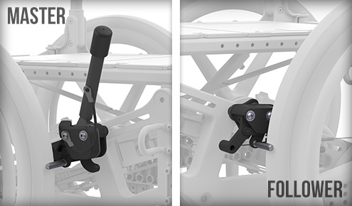 Enojna ročica upravlja oba zaklepa koles. Možnost za levo ali desno roko. Vključen podaljšek.