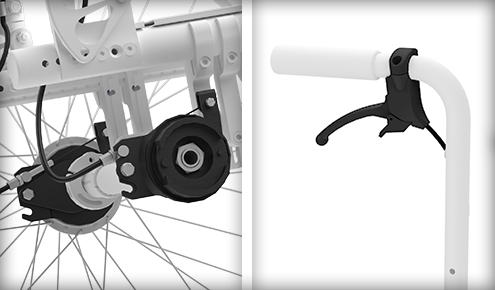 Deluje kot prava zavora, ki omogoča upočasnitev vozička namesto zgolj zaklepanja kolesa.