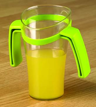 Ta elegantna skodelica je oblikovana tako, da prepreči stik z vašim nosom, ko je skodelica nagnjena, kar vam omogoča, da pijete, ne da bi nagnili glavo nazaj. Material je trpežen polikarbonat, ki je odporen na razpoke in podaljšuje življenjsko dobo skodelice. Ergonomska oblika zagotavlja udobno sedenje v roki, zaradi česar je enostaven za tiste z omejenim oprijemom. Skodelica je na voljo tudi s kompletom ročajev, ki se vpnejo v vstavljen rob okrog roba skodelice, kar pomaga osebam z omejenim vidom in po potrebi omogoča močnejši oprijem z dvema rokama. Majhne nastavke na skodelici preprosto poravnajte z ustreznimi luknjicami na ročaju in trdno pritisnite na svoje mesto. Če želite odstraniti ročaje, nežno zavrtite vsako stran in povlecite navzdol.